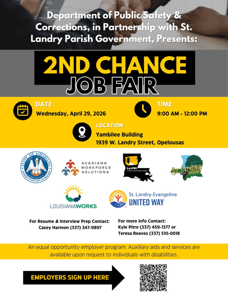 On April 29th from 9:00am to 12:00pm at the Yambilee Building located at 1939 W. Landry Street, Opelousas, LA 70570 a Second Chance Job Fair will be held. This event is tailored for: