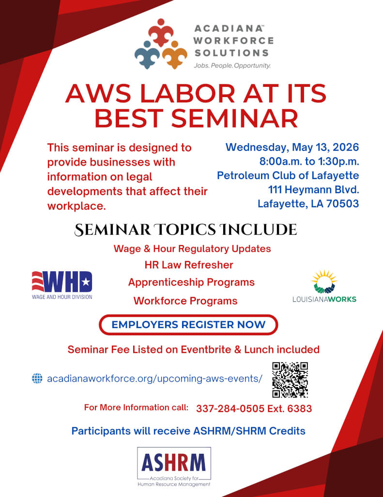 On May 13 from 8:00am to 1:30pm at the Petroleum Club of Lafayette, 111 Heymann Blvd, Lafayette, LA 70503. A labor law Seminar will be held. This event is tailored for local businesses in Acadiana Area. Topics include: